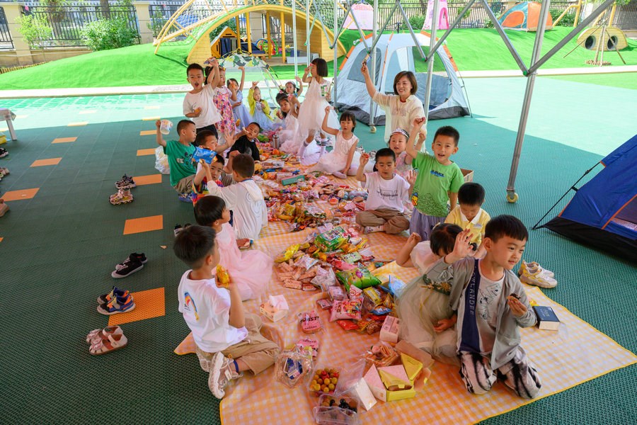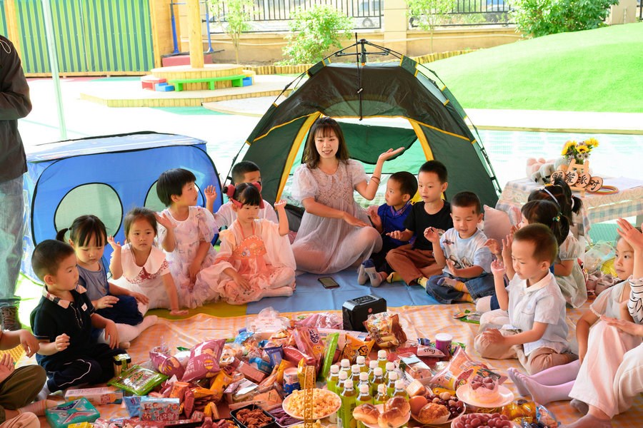 當日,在幼兒園的操場上,五顏六色的野餐墊鋪,可愛俏皮的帳篷,精致的裝飾,數不勝數的水果點心,小朋友們在陰涼處盡情享受著美味,與老師們一起享受著夏日里野餐派對的美好。