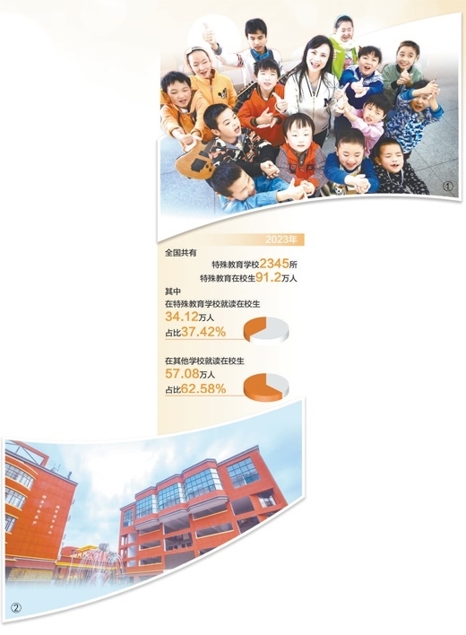 黨的十八大以來,從支持特殊教育,到辦好特殊教育,再到強(qiáng)化特殊教育普惠發(fā)展,我國(guó)特殊教育發(fā)展內(nèi)涵逐步深化,特殊教育普及水平和保障條件得到提升。2023年,全國(guó)共有特殊教育學(xué)校2345所,特殊教育在校生91.2萬人,其中,在特殊教育學(xué)校就讀在校生34.12萬人,占比37.42%;在其他學(xué)校就讀在校生57.08萬人,占比62.58%。