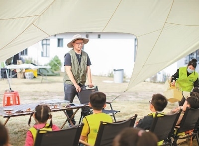潘偉在“蔬東坡”農(nóng)場給參加研學(xué)活動的孩子們做農(nóng)業(yè)知識科普。