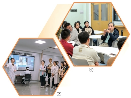 圖①:復旦大學“強國之路”思政大課小班討論課上,航空航天系教授艾劍良(右一)與學生交流。郭劍斌攝(人民視覺) 圖②:現(xiàn)場教學環(huán)節(jié),復旦大學上海醫(yī)學院學生在復旦大學附屬中山醫(yī)院了解智能醫(yī)療領域發(fā)展。張洪寅子攝(人民視覺)