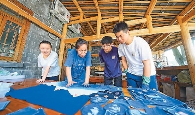 在貴州省黔東南苗族侗族自治州榕江縣三寶侗寨,來自貴州財經(jīng)大學(xué)的大學(xué)生學(xué)習(xí)非遺藍(lán)染知識。周光勝攝(人民圖片)