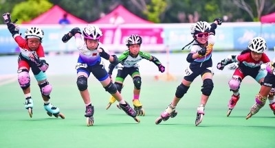 河南洛陽,小朋友們在體育公園內(nèi)參加速度輪滑友誼賽。新華社發(fā)