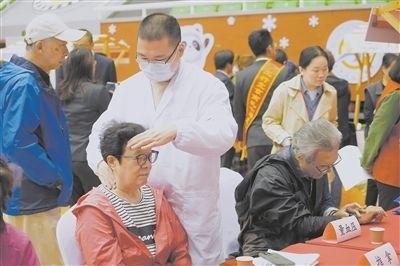 10月10日,2024年北京月壇街道重陽節(jié)為老服務(wù)市集活動(dòng)在月壇體育館舉行。北京中醫(yī)藥大學(xué)中醫(yī)學(xué)院的志愿者用自己所學(xué)的專業(yè)知識(shí)在市集上為老年人服務(wù)。圖為北京中醫(yī)藥大學(xué)中醫(yī)學(xué)院的志愿者在月壇體育館為老人服務(wù)。新華社記者 邢廣利攝