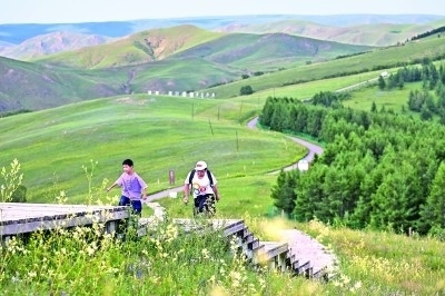 家長與孩子在內(nèi)蒙古大青山國家級自然保護(hù)區(qū)徒步。新華社發(fā)