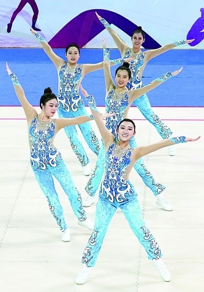 12月5日,第18屆中國(guó)大學(xué)生健美操錦標(biāo)賽在河北省遷安市舉行。圖為江西師范大學(xué)代表隊(duì)在甲組中國(guó)大學(xué)生中級(jí)校園健美操規(guī)定動(dòng)作決賽中。新華社記者 楊世堯攝