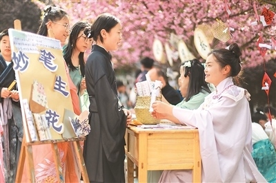 近年來,為更好地傳承詩歌文化,貴州省黔西市觀音洞鎮(zhèn)沙井小學(xué)每年春天都會(huì)舉辦校園詩歌文化節(jié)系列活動(dòng),老師帶領(lǐng)學(xué)生身著漢服寫詩歌,朗誦詩歌,猜詩歌謎語。圖為學(xué)生在向老師朗誦自己寫的詩歌。