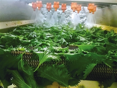 在紫蘇基地加工車間,20多名工人正在熱火朝天地忙碌著,采摘好的紫蘇葉在這里經(jīng)過清洗、精選、包裝等多道工序處理后,會(huì)按照不同品級(jí)進(jìn)行精細(xì)化捆扎分類,然后被送入冷庫進(jìn)行預(yù)冷,整個(gè)操作都是在無菌環(huán)境下進(jìn)行?!艾F(xiàn)在臨時(shí)工、長期工加一起有20多人,5年來,我們?cè)谄咣倥_(tái)村、什不斜氣村、什拉烏素村等周邊培訓(xùn)了村民200人左右,他們每年農(nóng)閑時(shí)就會(huì)來基地打工,男工負(fù)責(zé)大棚管理、種植,女工負(fù)責(zé)采葉子、分葉子、包葉子?!卑合蛴浾呓榻B道。
