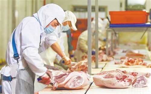 7月15日,北京二商肉類(lèi)食品集團(tuán)有限公司員工在肉類(lèi)分割流水線上工作。新華社記者 李欣 攝