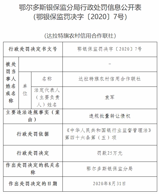 北疆新聞網(wǎng)、北疆新聞客戶(hù)端消息(記者 張楊)11月5日,銀保監(jiān)會(huì)官網(wǎng)通報(bào)達(dá)拉特旗農(nóng)村信用合作聯(lián)社違規(guī)批量轉(zhuǎn)讓債權(quán),被鄂爾多斯銀保監(jiān)分局依據(jù)《中華人民共和國(guó)銀行業(yè)監(jiān)督管理法》第四十六條第(五)項(xiàng),處以罰款25萬(wàn)元。其法定代表人李海淵作為達(dá)拉特旗農(nóng)村信用合作聯(lián)社違規(guī)批量轉(zhuǎn)讓債權(quán)的違規(guī)行為直接責(zé)任人,被鄂爾多斯銀保監(jiān)分局依據(jù)《中華人民共和國(guó)銀行業(yè)監(jiān)督管理法》第四十八條第一款第(二)項(xiàng),處以警告處罰。