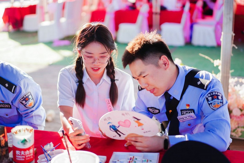 活動現(xiàn)場,布置溫馨浪漫,單身男民警與優(yōu)秀女青年歡聚一堂,在“電影配音”、“趣味問答”、“手繪團扇”、“心動時刻”等廣大青年喜聞樂見的游戲環(huán)節(jié)中展現(xiàn)才藝,歡快互動、輕松交流,現(xiàn)場處處洋溢著幸福的喜悅。