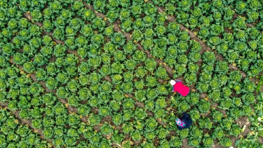 2021年11月4日,河北省唐山市豐南區(qū)王蘭莊鎮(zhèn)高先甸村的菜農(nóng)在蔬菜基地收獲大白菜(無(wú)人機(jī)照片)。新華社發(fā)(劉滿倉(cāng)攝)