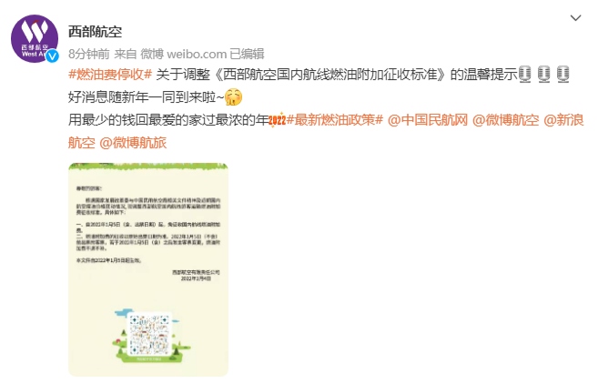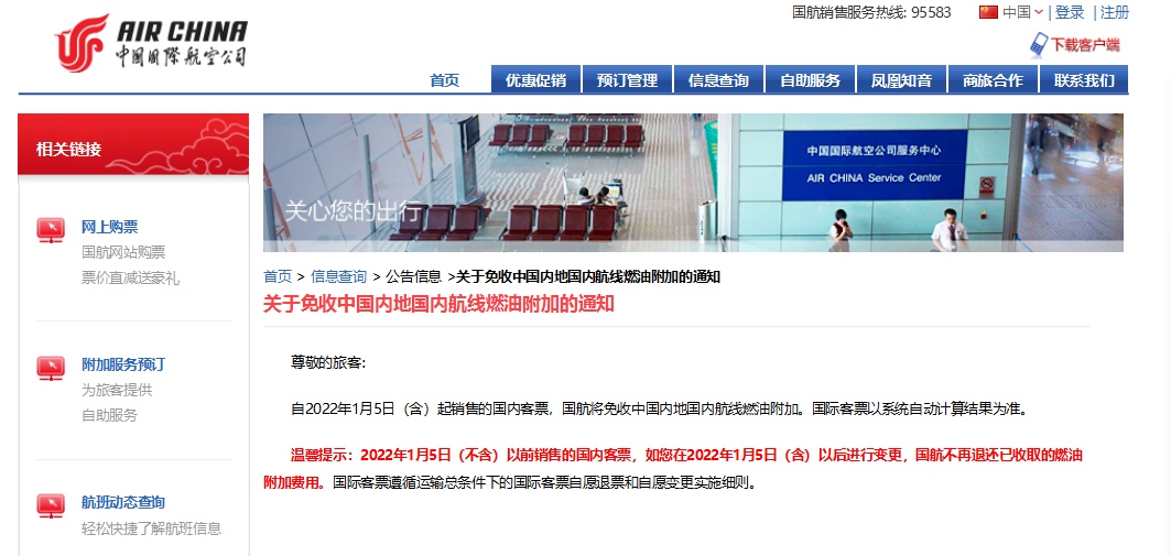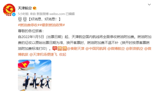 今日,中國(guó)國(guó)際航空、海南航空、天津航空、西部航空等多家航空公司發(fā)布通知,根據(jù)國(guó)家發(fā)展改革委、民航局的相關(guān)文件精神,自2022年1月5日零時(shí)起(出票日期),取消征收國(guó)內(nèi)航線(xiàn)燃油附加費(fèi)。