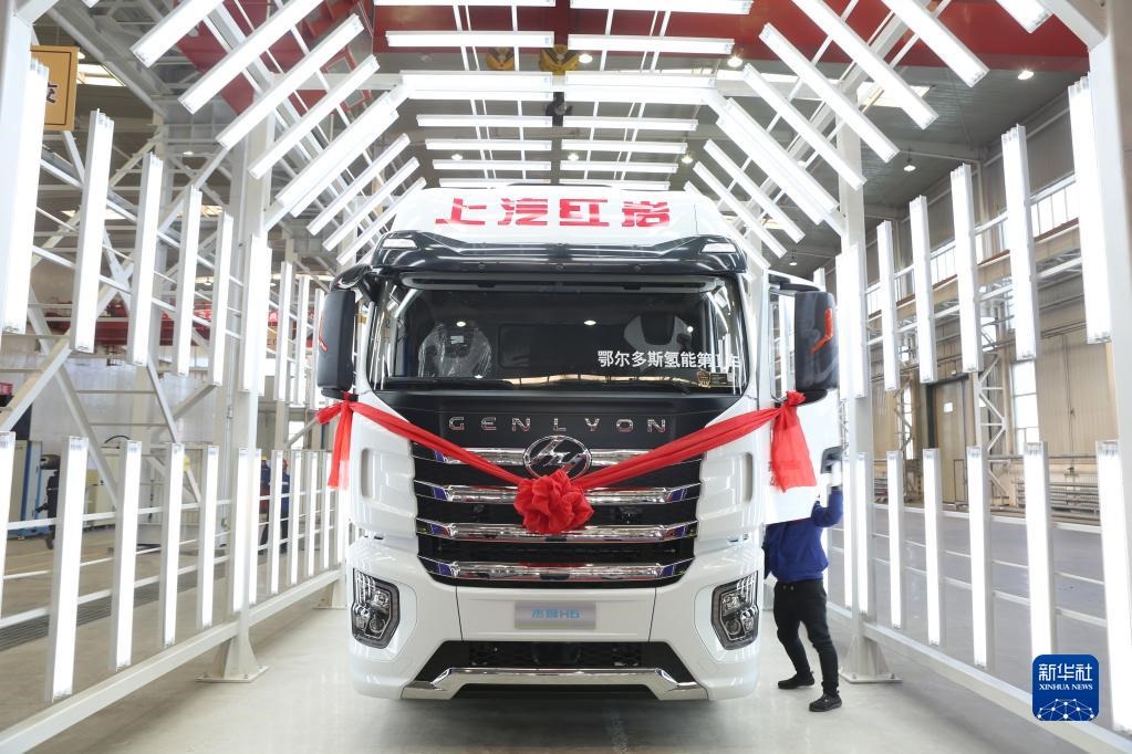 上汽紅巖鄂爾多斯基地天隆工廠生產(chǎn)的首臺(tái)氫能重卡。(受訪者供圖)