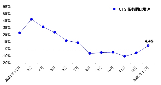 數(shù)據(jù)顯示,2022年1-2月,中國運輸生產(chǎn)指數(shù)(CTSI)均值為153.8點,同比增長4.4%。分結(jié)構(gòu)看,CTSI貨運指數(shù)均值為188.2點,同比增長4.1%;CTSI客運指數(shù)均值為83.8點,同比增長4.7%。