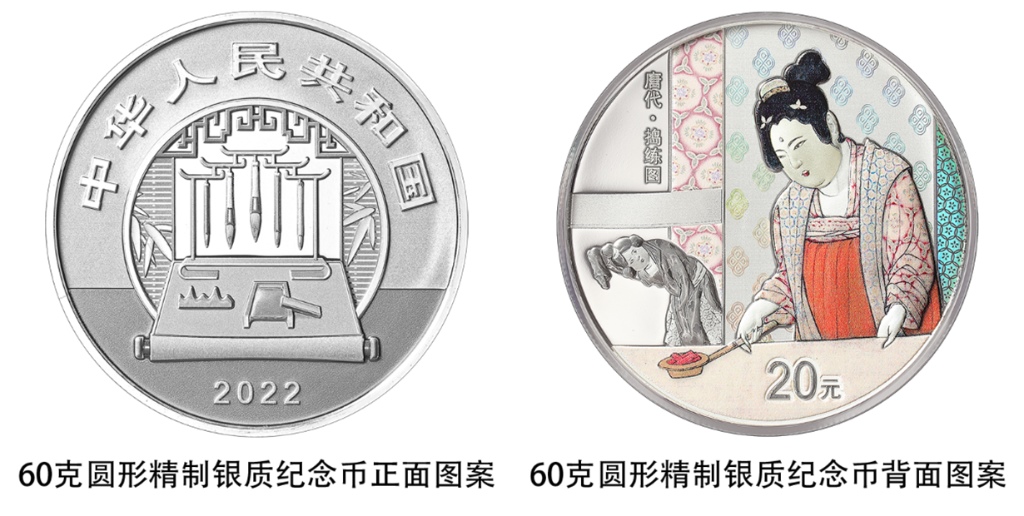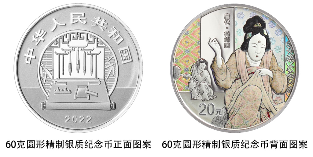 一枚60克圓形銀質(zhì)紀(jì)念幣背面圖案為《搗練圖》中熨燙、嬉戲造型,襯以裝飾紋樣組合設(shè)計,并刊“唐代·搗練圖”字樣及面額。