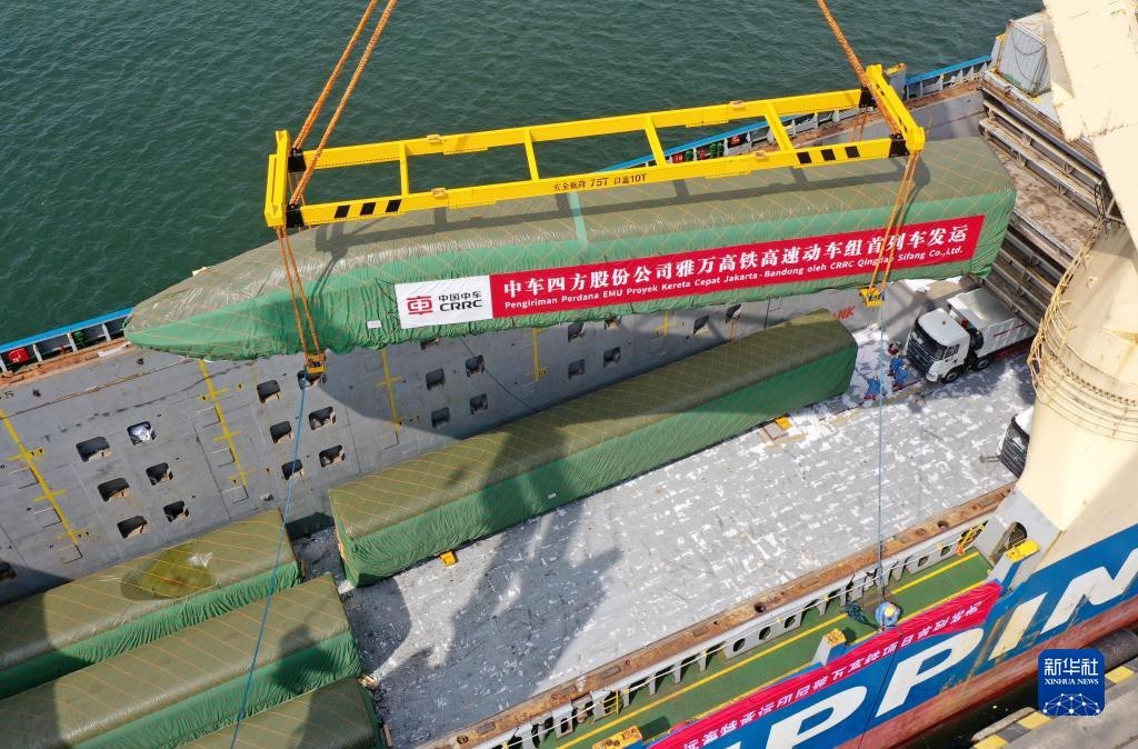 雅萬高鐵高速動(dòng)車組在山東港口青島港裝船(8月18日攝)。新華社發(fā)(姜超 攝)