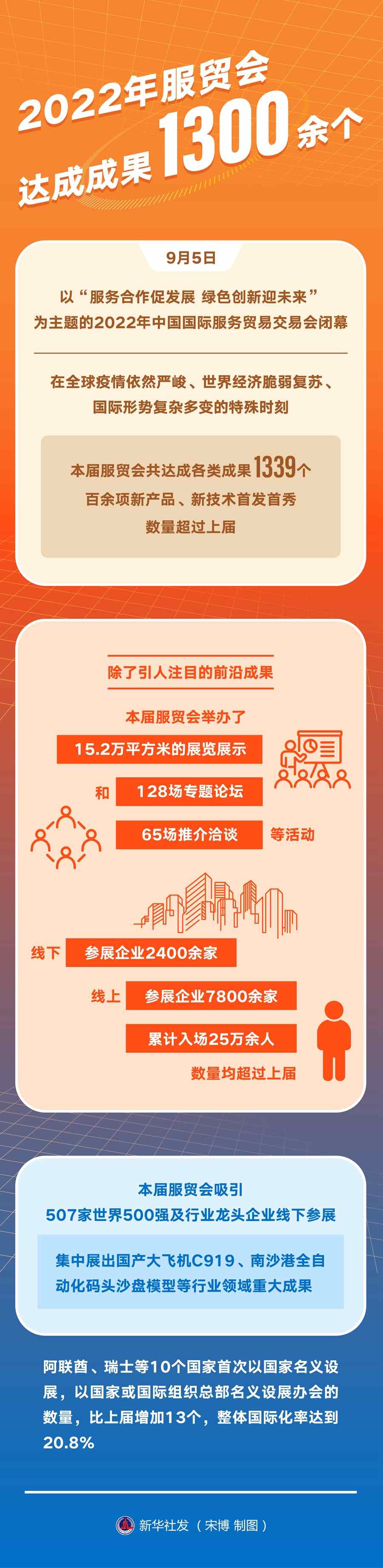 9月5日,以“服務(wù)合作促發(fā)展綠色創(chuàng)新迎未來(lái)”為主題的2022年中國(guó)國(guó)際服務(wù)貿(mào)易交易會(huì)閉幕。在全球疫情依然嚴(yán)峻、世界經(jīng)濟(jì)脆弱復(fù)蘇、國(guó)際形勢(shì)復(fù)雜多變的特殊時(shí)刻,本屆服貿(mào)會(huì)共達(dá)成各類成果1339個(gè),百余項(xiàng)新產(chǎn)品、新技術(shù)首發(fā)首秀,數(shù)量超過上屆。