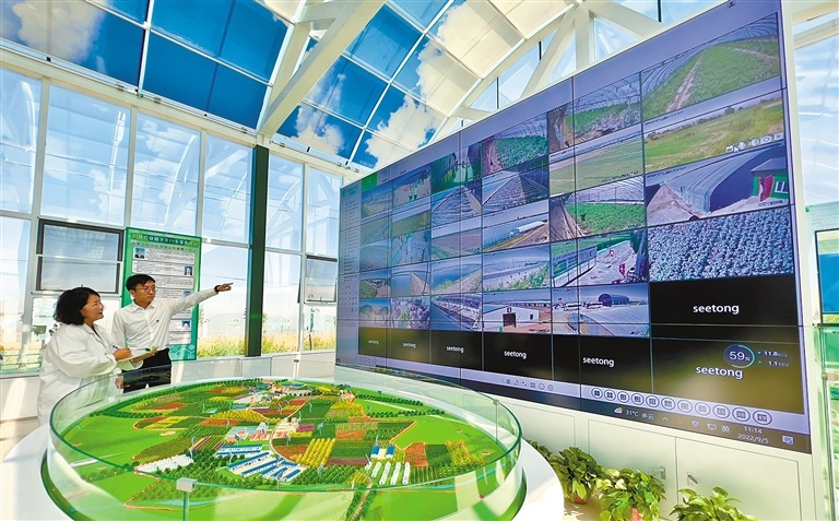近日,巴彥淖爾市杭錦后旗二道橋鎮(zhèn)鄉(xiāng)村振興設施農(nóng)業(yè)產(chǎn)業(yè)園區(qū)工作人員正在記錄現(xiàn)代農(nóng)業(yè)數(shù)字平臺監(jiān)測數(shù)據(jù)。據(jù)悉,該園區(qū)占地2000畝,投資4600萬元,是集智慧農(nóng)業(yè)管理、引黃滴灌示范、集中連片種植等多項功能為一體的現(xiàn)代農(nóng)業(yè)產(chǎn)業(yè)園區(qū)。通過現(xiàn)代農(nóng)業(yè)數(shù)字平臺,進行智能管控、農(nóng)產(chǎn)品質量檢測、科技培訓、遠程科技指導,同時讓更多的農(nóng)戶利用APP與平臺共享數(shù)據(jù)資源,實現(xiàn)田間自動化管理。園區(qū)通過平臺智能管控,今年第一茬種植麒麟西瓜,第二茬計劃種植葉菜類,兩茬畝均效益預計在2萬元以上。(記者 孟和朝魯 攝影報道)