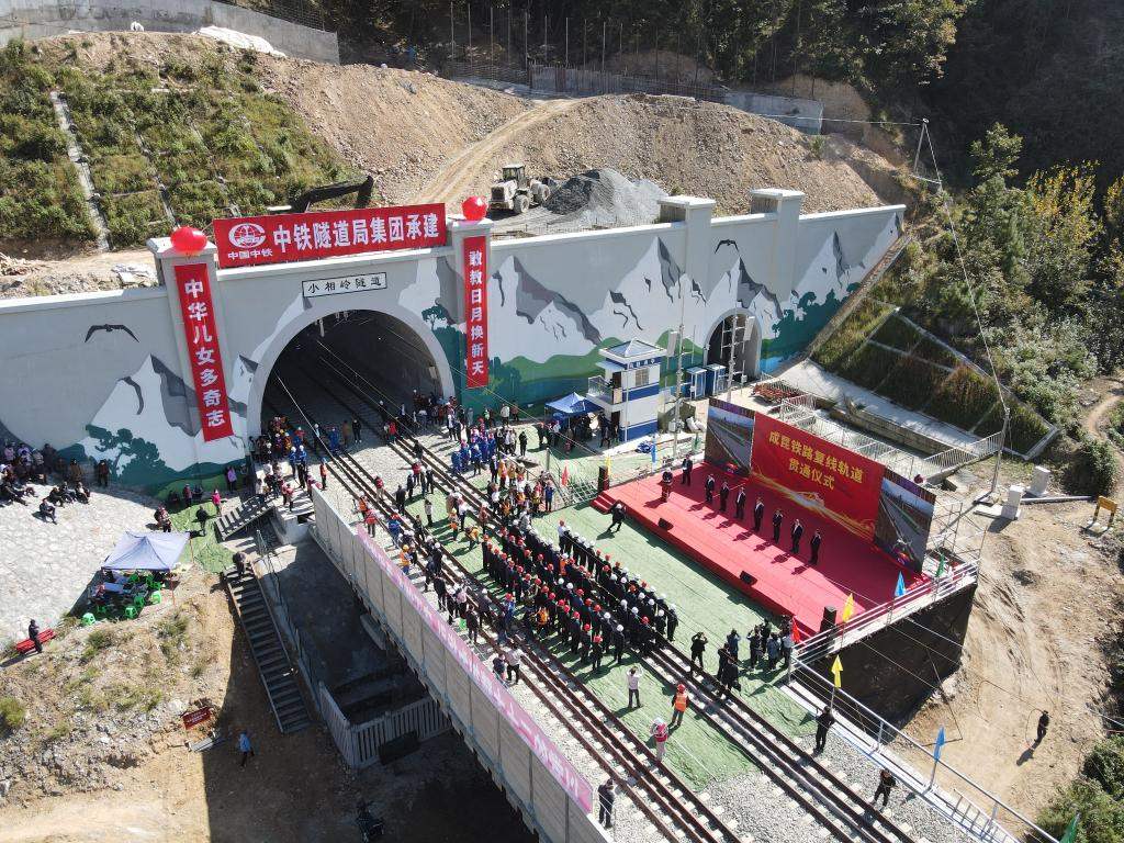 小相嶺隧道口的成昆鐵路復(fù)線軌道貫通儀式現(xiàn)場(chǎng)。(中國(guó)鐵路成都局集團(tuán)公司供圖)