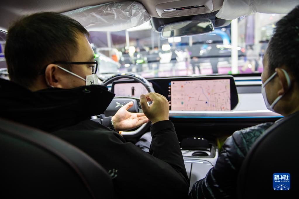 12月24日,在長沙國際會(huì)展中心,工作人員(左)向觀眾介紹展車。新華社記者 陳思汗 攝