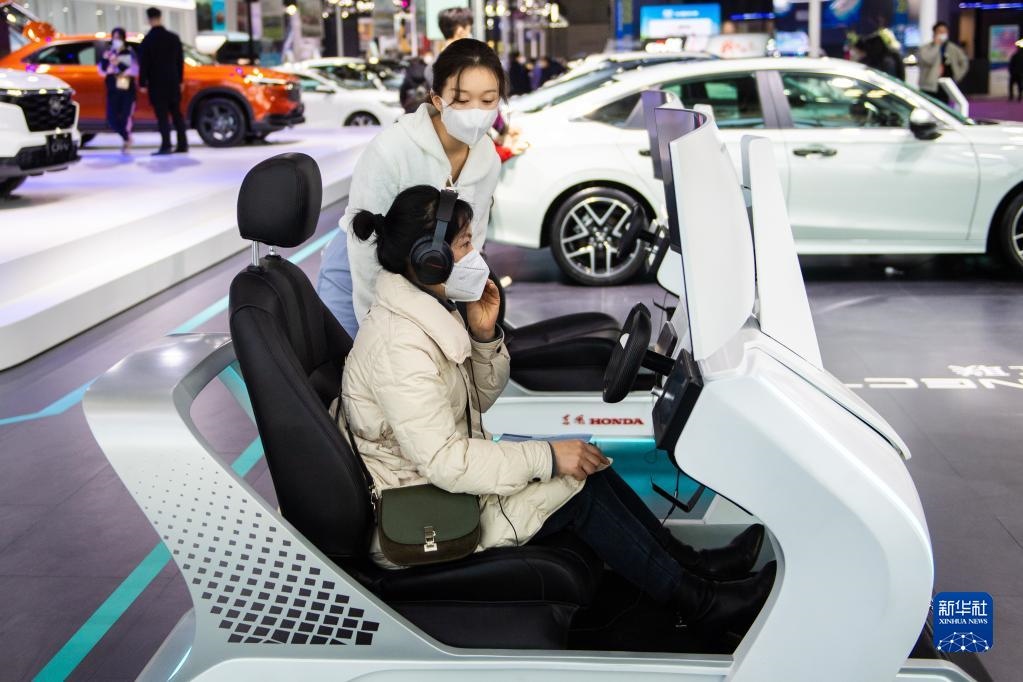 12月24日,在長沙國際會(huì)展中心,觀眾(前)在虛擬駕駛艙上體驗(yàn)。新華社記者 陳思汗 攝