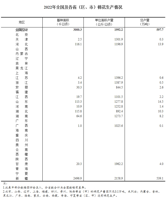 國(guó)家統(tǒng)計(jì)局26日公布數(shù)據(jù)顯示,根據(jù)對(duì)全國(guó)31個(gè)省(區(qū)、市)的統(tǒng)計(jì)調(diào)查(新疆棉花播種面積通過(guò)遙感測(cè)量取得),2022年全國(guó)棉花播種面積4500.4萬(wàn)畝,比上年減少41.8萬(wàn)畝,下降0.9%;單產(chǎn)132.8公斤/畝,比上年增加6.6公斤/畝,增長(zhǎng)5.3%;產(chǎn)量597.7萬(wàn)噸,比上年增加24.6萬(wàn)噸,增長(zhǎng)4.3%。