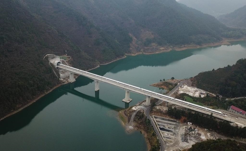 圖為“復(fù)興號”列車行駛經(jīng)過杭黃高鐵位于浙江淳安的進(jìn)賢溪大橋(無人機(jī)拍攝)。新華社記者 黃宗治 攝