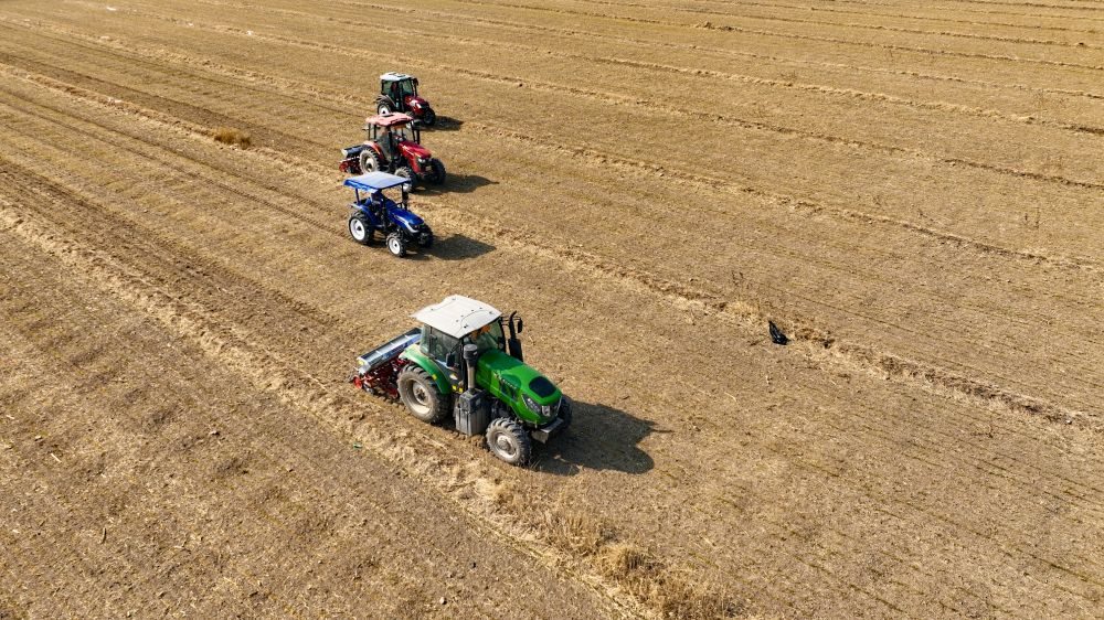 樂陵市來秋農(nóng)機(jī)服務(wù)專業(yè)合作社的四臺新式追肥機(jī)正在麥田進(jìn)行追肥作業(yè)。