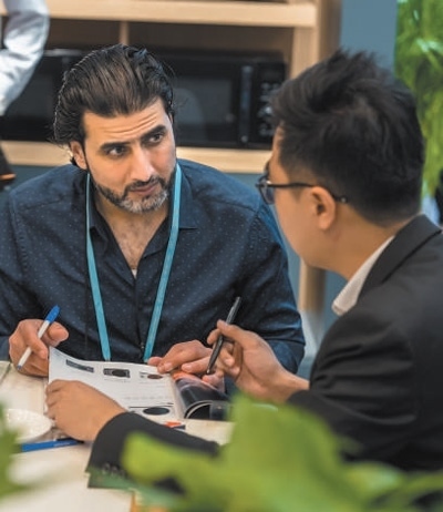 采購商(左)與參展商在洽談業(yè)務。