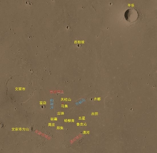 科學研究團隊通過火星高分影像,識別了著陸點附近大量的地理實體,國際天文聯(lián)合會根據(jù)相關規(guī)則,將其中的22個地理實體,以中國人口數(shù)小于10萬的歷史文化名村名鎮(zhèn)加以命名。將中國標識永久刻印在火星大地。