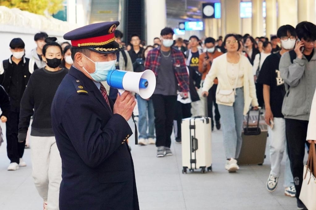 淄博火車站工作人員在引導出站旅客。新華社發(fā)(劉炳友 攝)