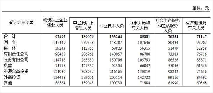 2022年分登記注冊(cè)類(lèi)型分崗位就業(yè)人員年平均工資。圖片來(lái)源:國(guó)家統(tǒng)計(jì)局官網(wǎng)
