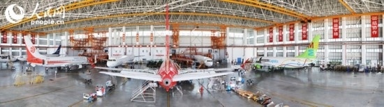 機(jī)庫(kù)內(nèi)等待維修的飛機(jī)。 人民網(wǎng)記者 孟凡盛攝