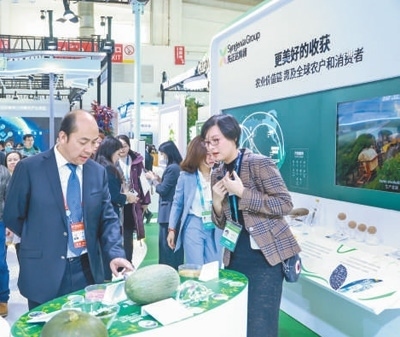 觀眾(左)在先正達集團展臺參觀。本報記者 白真智攝