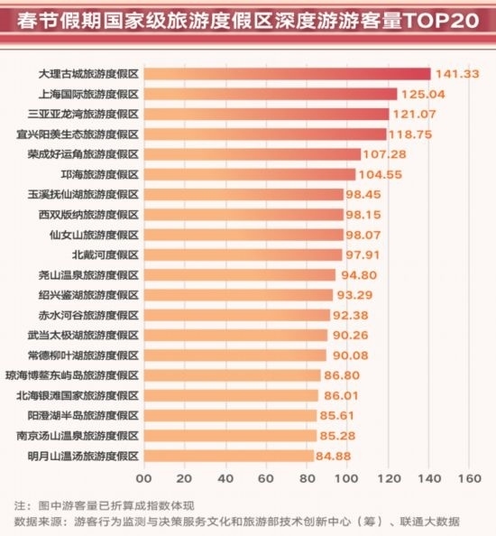春節(jié)假期,全國(guó)63家國(guó)家級(jí)旅游度假區(qū)共接待深度游客(在度假區(qū)停留2小時(shí)以上的游客人數(shù),本部分以下簡(jiǎn)稱(chēng)“深度游”)793.4萬(wàn)人,按可比口徑較2023年增長(zhǎng)了42.3%,增長(zhǎng)顯著。其中深度游前20的度假區(qū)共接待478.5萬(wàn)人。