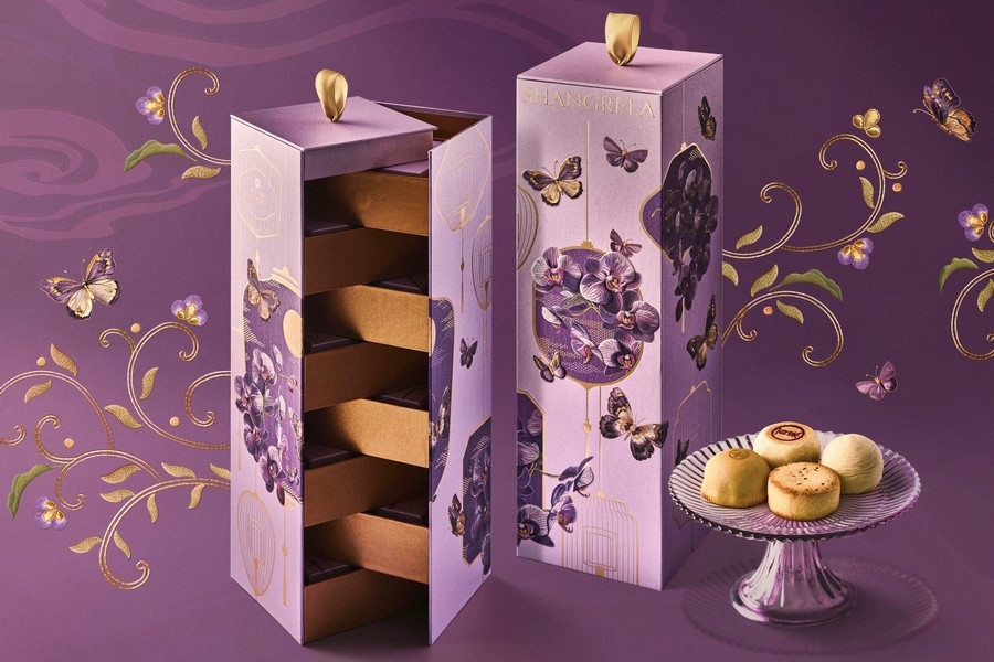童心未泯家庭款月餅,創(chuàng)意可愛的小火車造型,一盒囊括哈密瓜鳳梨雙果、紅豆山楂、巧克力牛奶芯三種新穎口味,滿載溫馨與甜蜜緩緩駛來;賞心月目雪媚娘流心月餅,打破傳統(tǒng)的禮盒,采用了別致巧思的浪漫禮包,包內裝有雪媚娘巧克力流心核桃栗子、烏龍白桃水蜜桃流心、陳皮土鳳梨金桔流心和抹茶紅豆草莓流心月餅,細膩爽口,唇齒滿足, 給味蕾帶來別樣享受;八方鴻運月餅,八珍玉食,八面玲瓏,禮盒中包含廣式單黃白蓮蓉、蘇式百果椒鹽、瓊式純鳳梨酥、京式自來紅、潮式松露鮑魚、晉式蛋月燒棗泥松仁、滇式玫瑰云腿、川香牛肉藤椒軟心,可甜可咸,款款新意,薈萃八方鴻運,饋贈四方親朋;香格里拉手提箱月餅,設計精巧的手提箱,薈萃亞洲滋味,馬來西亞白咖啡、椰汁西米、宇治抹茶、榴蓮、芒果柚子、香蘭葉月餅,一盒六味,配上軟糯綿化的桃山皮,一口甘香,馥郁悠長。一系列月餅禮盒,結合濃郁當?shù)靥厣摹把蛉舛Y盒”、“燒麥禮盒”、“烤羊腿禮盒”,還有香格里拉定制青島啤酒、醬香白酒、甄選紅酒等為節(jié)日助興。