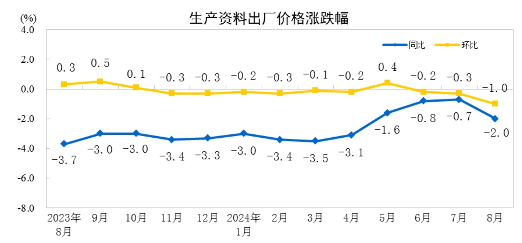 2024年8月份,全國工業(yè)生產者出廠價格同比下降1.8%,環(huán)比下降0.7%;工業(yè)生產者購進價格同比下降0.8%,環(huán)比下降0.6%。1—8月平均,工業(yè)生產者出廠價格比上年同期下降1.9%,工業(yè)生產者購進價格下降2.1%。
