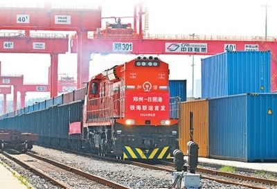首趟鄭州至日照港鐵海聯(lián)運(yùn)班列從鄭州經(jīng)開(kāi)區(qū)圃田站啟程。王 瑋攝(影像中國(guó))