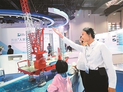 第十六屆國際交通技術(shù)與設(shè)備展覽會上,觀眾在參觀“大橋海風”號風電安裝船。杜建坡攝(人民圖片)