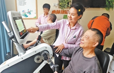 重慶萬(wàn)盛經(jīng)開(kāi)區(qū)安博馨社區(qū)“智慧養(yǎng)老”養(yǎng)老中心,服務(wù)人員為老人講解智能器材知識(shí)。