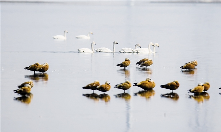 土默特左旗森林公安局副局長王強告訴記者,隨著生態(tài)環(huán)境的日益改善,海流水庫已成為候鳥遷徙途中的重要棲息“驛站”,每年春秋兩季在海流水庫過境的候鳥高達百萬只,種類涉及天鵝、遺鷗、大雁、蒼鷺等十余種,其中不乏國家一、二級重點保護動物。更可喜的是,現(xiàn)在海流水庫已經(jīng)有赤麻鴨長期駐留。
