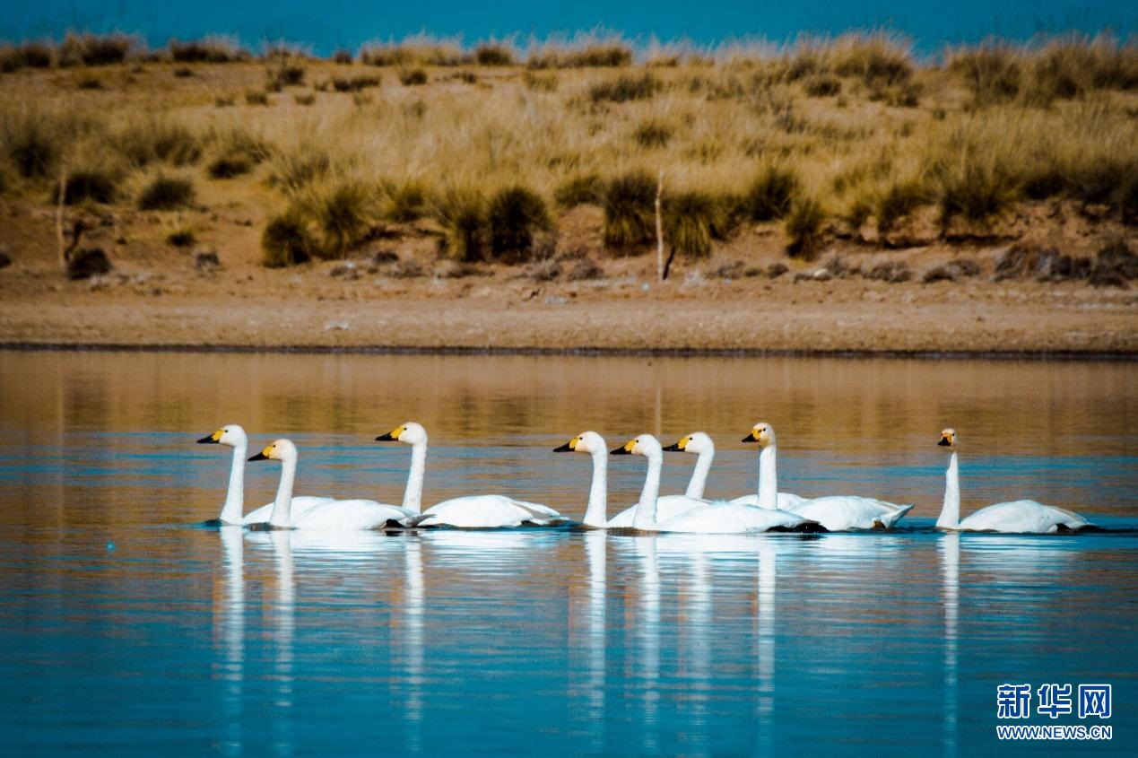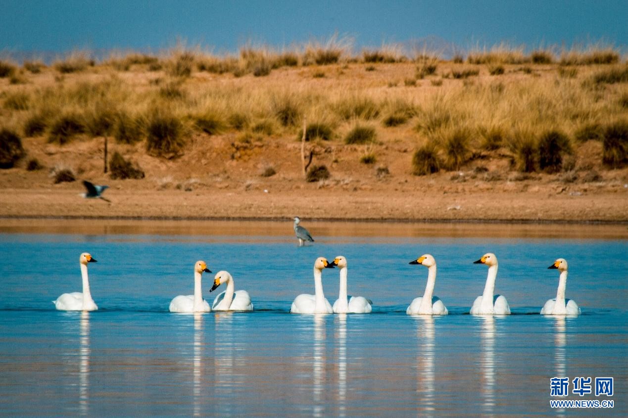 天鵝在河中游弋。新華網(wǎng)發(fā)(董靜 攝)