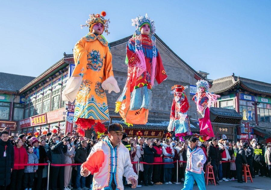 2024年2月15日,民間藝人在呼和浩特新春文化廟會(huì)現(xiàn)場(chǎng)進(jìn)行國家級(jí)非物質(zhì)文化遺產(chǎn)代表性項(xiàng)目腦閣表演。丁根厚 攝