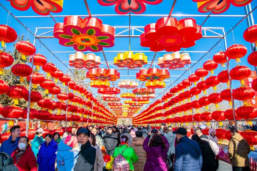 2024年2月15日,人們?cè)诤艉秃铺厥杏袢獏^(qū)塞上老街旅游休閑街區(qū)燈籠長廊內(nèi)游玩。丁根厚 攝