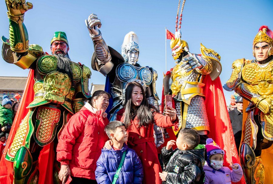 2024年2月15日,人們?cè)诤艉秃铺厥杏袢獏^(qū)塞上老街旅游休閑街區(qū)與國風(fēng)機(jī)甲拍照留影。丁根厚 攝