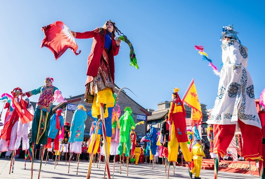 2024年2月15日,民間藝人在呼和浩特新春文化廟會(huì)現(xiàn)場(chǎng)進(jìn)行踩高蹺表演。丁根厚 攝