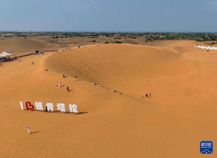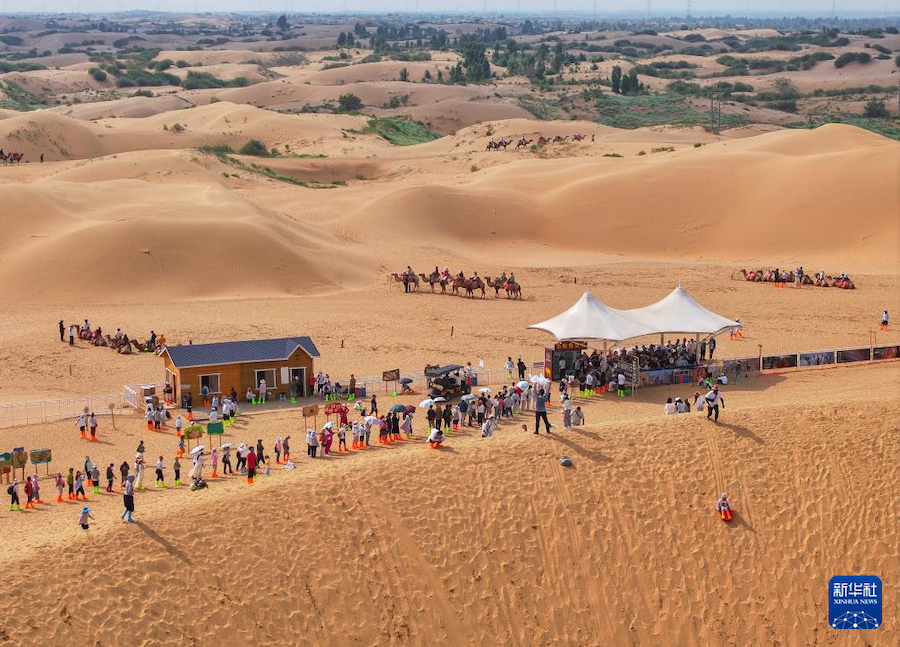 盛夏時節(jié),內(nèi)蒙古鄂爾多斯市庫布其沙漠迎來旅游旺季。在達(dá)拉特旗銀肯塔拉和響沙灣景區(qū),來自各地的游客絡(luò)繹不絕。