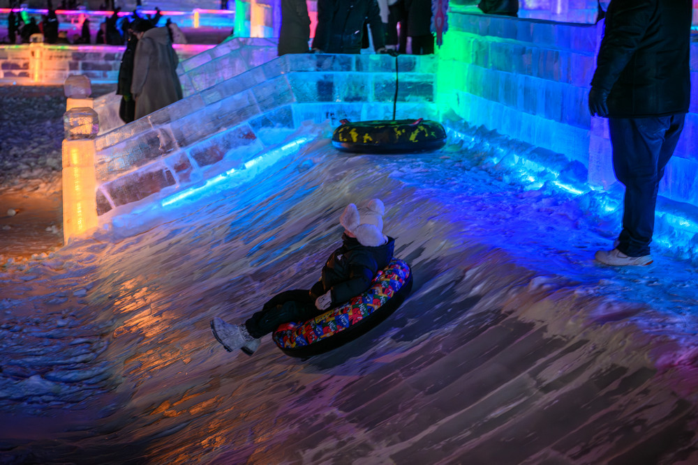 園區(qū)內(nèi)更是熱鬧非凡。中式“北國(guó)第一門”、俄式童話城堡、蒙式游牧風(fēng)情三大特色入口,成了游客打卡的首選地。258米長(zhǎng)的中式主題雪墻鋪展著“萬(wàn)里茶道”的傳奇故事,復(fù)古火車站、蒸汽機(jī)車雪雕復(fù)刻著中東鐵路的舊時(shí)光,隨手一拍都是自帶氛圍感的大片。冰雪滑梯、雪地碰碰球等十余項(xiàng)娛樂(lè)項(xiàng)目前排起了長(zhǎng)隊(duì),大人小孩都玩得不亦樂(lè)乎;蒙古包暖屋里,熱氣騰騰的奶茶、鮮燉烤梨香氣四溢,暖心又暖胃??萍几欣瓭M了游玩體驗(yàn),不少游客拿著手機(jī)掃碼體驗(yàn)語(yǔ)言冰書冰墻,中俄蒙常用語(yǔ)一學(xué)就會(huì),還有炫彩音樂(lè)噴泉冰柱打造互動(dòng)琴鍵裝置,時(shí)光之門光幕呈現(xiàn)科幻特效。