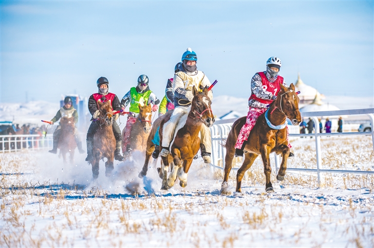 1月18日,錫林浩特市那達(dá)慕風(fēng)情園內(nèi)馬蹄踏雪、人聲鼎沸,“歌游內(nèi)蒙古·暢享錫林浩特”——冬季那達(dá)慕暨蒙古馬超級(jí)聯(lián)賽在歡騰的歌聲中拉開序幕。開幕式上,隨著馬蹄的噠噠聲,一支雄壯的馬隊(duì)踏雪而來(lái),騎手們身著艷麗的蒙古袍,駕馭著矯健的蒙古馬,以整齊的隊(duì)列自遠(yuǎn)處緩緩走來(lái)。歌聲悠揚(yáng),舞姿豪邁,演員們以動(dòng)人的演繹,完美詮釋了力量與藝術(shù)之美。本次賽事包含15公里耐力賽、10公里3人團(tuán)體接力賽、跑馬射箭、跑馬拾哈達(dá)、6公里走馬及搏克比賽等比賽項(xiàng)目。賽場(chǎng)上,騎手們馭馬飛馳,人與馬默契配合,在銀裝素裹的雪原上縱橫馳騁。在跑馬射箭與跑馬拾哈達(dá)項(xiàng)目上,騎手在飛奔的馬匹上挽弓搭箭、俯身拾物,動(dòng)作行云流水,精湛技藝引來(lái)觀眾陣陣驚呼與贊嘆。除了扣人心弦的比賽,本次活動(dòng)還為游客打造了豐富的冰雪互動(dòng)體驗(yàn)。冰雪涮肉宴香氣四溢,草原篝火電音派對(duì)將熱情推向高潮,千人雪戰(zhàn)、雪地拔河等趣味項(xiàng)目讓游客親身參與,盡情享受冰雪樂(lè)趣?,F(xiàn)場(chǎng)還同步舉辦了錫林浩特“伊德喜”草原冬儲(chǔ)肉展銷活動(dòng),讓游客在觀賽之余,還能選購(gòu)到正宗錫林郭勒牛羊肉,體驗(yàn)純正的草原風(fēng)味。(記者