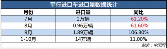 除了新能源汽車進口量增長,平行進口車也成為了一大亮點。根據數據顯示,今年7、8月份,我國平行進口車在進口車市場中成績還屬較差。其中,7月份平行進口車進口量約為1萬輛,同比下滑了61.2%;8月份平行進口車進口量也不理想,僅有9600輛,同比下滑了61.6%。但就在9月份,平行進口車數量則出現了大幅攀升。根據國機汽車數據統(tǒng)計,9月份我國平行進口汽車進口量約為1.89萬輛,同比大增106.3%。今年1-10月,平行進口車數量共14.0萬輛,同比上漲了11.0%,占進口總量的16%。詳情見下表: